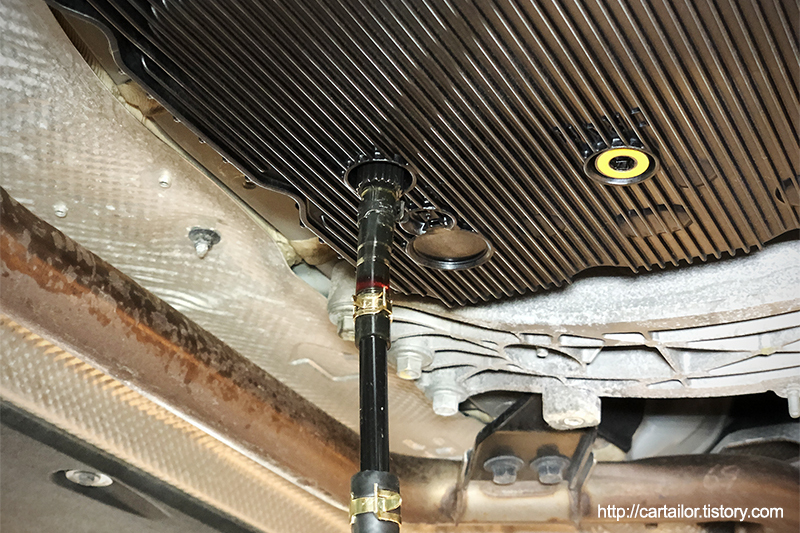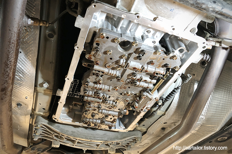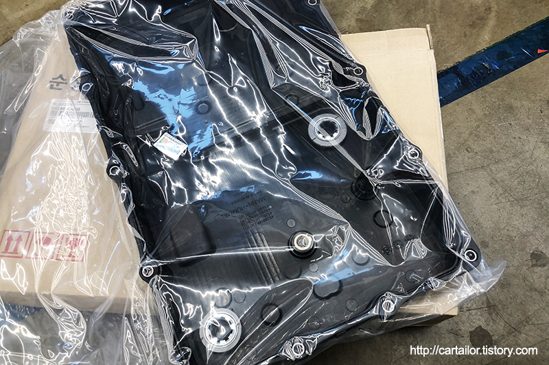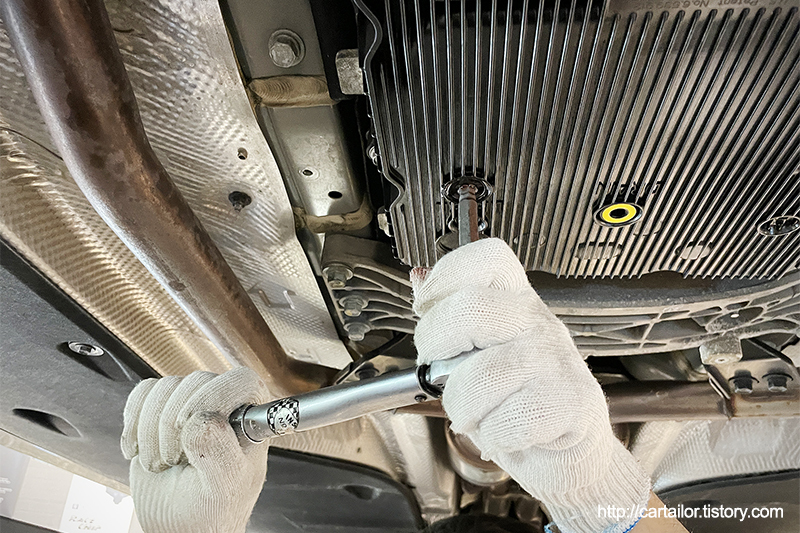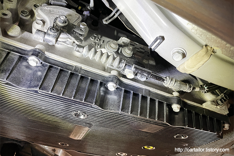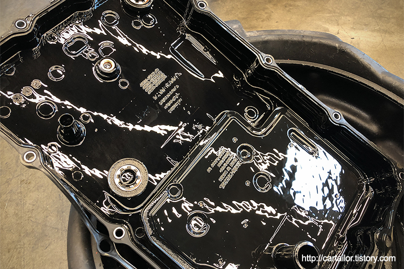 해당 차량의 변속기는 현대 파워텍의 8단 자동변속기를 사용하지만, ZF변속기들 처럼 오일팬과 필터가 일체형인 방식을 사용하고 있습니다.
