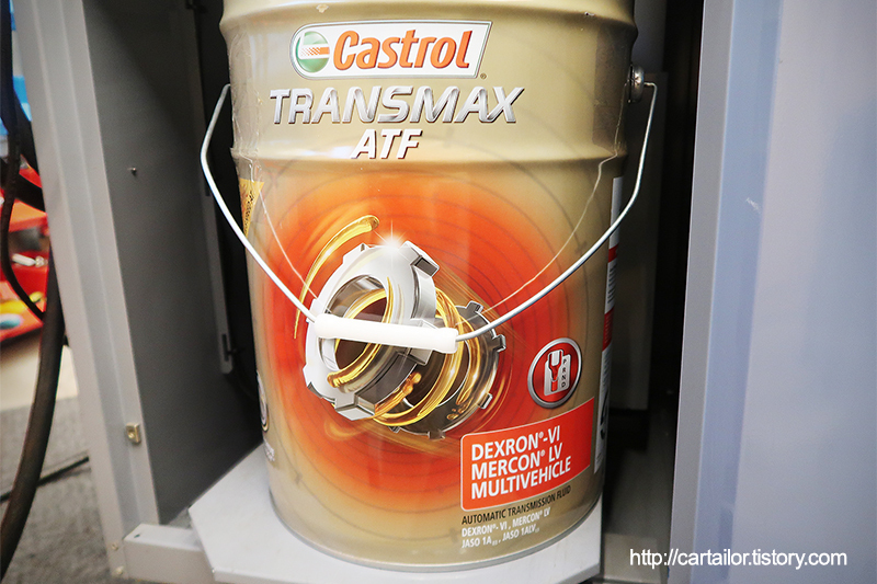 해당 차량의 자동변속기 액 규격은 "ATF SP-IV-RR" 입니다. 현대 파워텍 후륜구동형 8단 전용 규격으로, 해당 규격을 정확히 충족하는 캐스트롤 트랜스맥스 DEXRON-6 제품으로 준비합니다. DEXRON-6가 GM이나 쉐보레 차량 전용으로 아시는 분들도 많은데, DEXRON-6 공식인증 제품의 경우 ZF변속기(저점도), CVT(고점도)나 DCT 등의 특수한 자동변속기를 제외하면, 일반적인 토크컨버터 형식의 자동변속기의 모든 규격을 충족한다고 보면 되는 가장 엄격한 최상위 규격으로 보시면 되겠습니다. 그만큼 동일 메이커의 DEXRON 인증이 제외된 일반적인 멀티 규격의 변속기 액보다 가격도 원가 기준, 2배 가까이 높습니다.