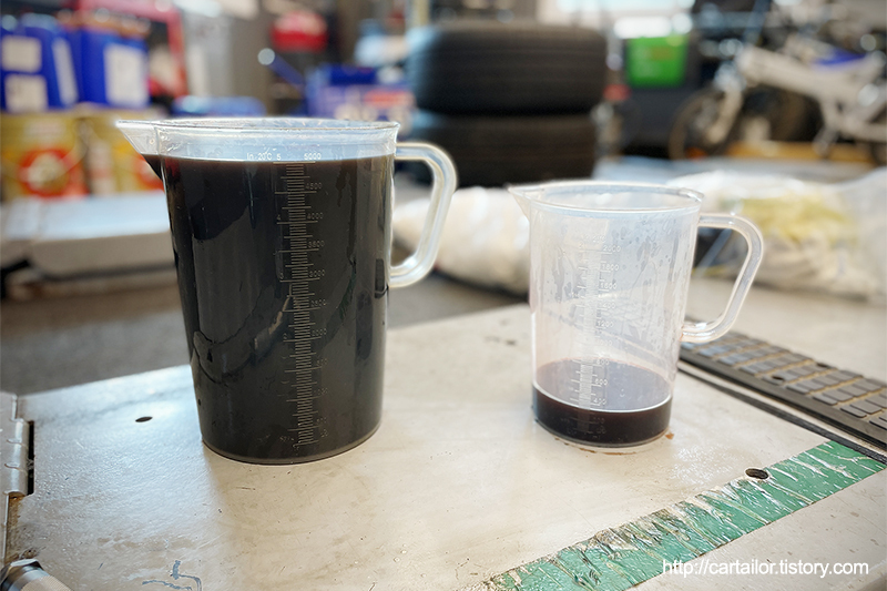 배출된 사용유 입니다. 육안으로 보이는 상태는 크게 나빠 보이지 않으며, 양은 살짝 모자릅니다.