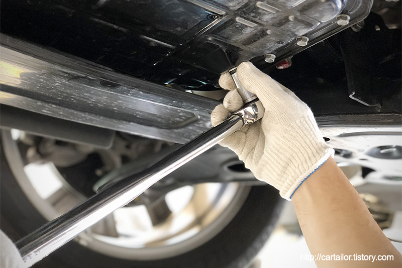 준비된 오일필터와 신품으로 교체한 필터하부 드레인볼트를 손으로 1차 체결 후 토크렌치를 사용하여 규정토크로 정확하게 잠가 줍니다.