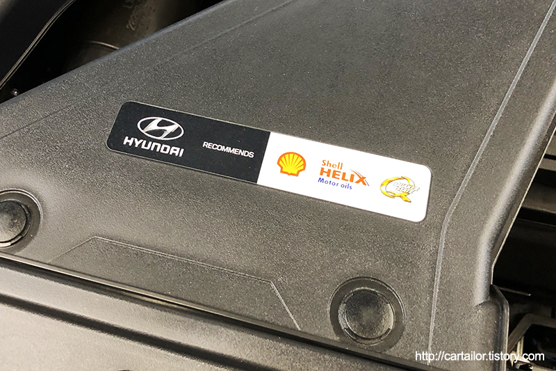 그리고 대부분의 현대 기아차 보넷을 열어보면, 에어크리너 덕트 입구에 이런 스티커가 붙어 있는데요, 자세히 보면 제조사인 현대차에서 쉘사의 엔진오일을 권장한는 내용입니다. 실제 현대 순정유도 고급라인에는 VHVI기반에 GTL기유가 일부 첨가되기도 하는 만큼 믿고 사용할 수 있겠습니다. 참고로 쉘은 윤활유 제조사, 그리고 Helix는 엔진오일 라인이며, ULTRA제품은 Helix 제품군의 플래그 쉽 라인입니다.