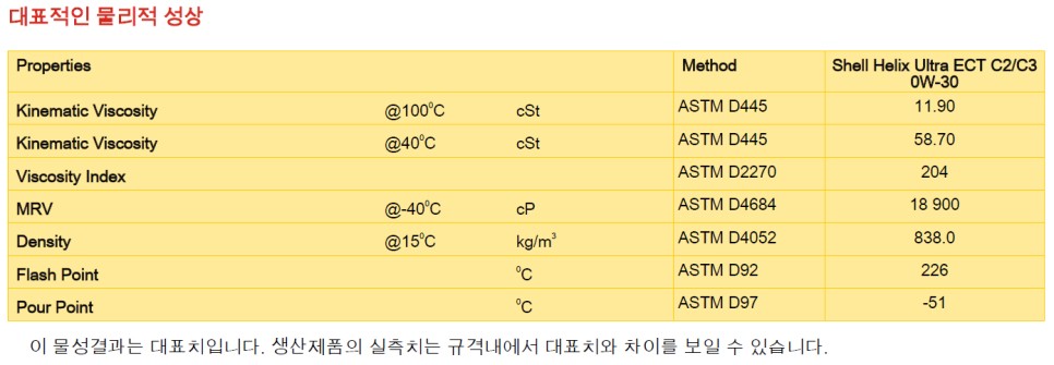 섭시 15도의 밀도는 838Kg/m3 로 왠만한 0W20 가솔린 전용 합성유 보다 묽습니다. 그리고 냉간 유동성을 보여주는 지표 중 하나인, 섭씨 40도씨 동점도 역시 58.70mm2/s 으로 보통의 5W30 합성유들 보다 묽은편입니다. 즉 높은 냉간유동성 및 시동성을 보장받을 수 있으며, 첫 시동 이후 오일이 순환되는 속도가 빨라 엔진보호에 유리하며 유온상승도 빠를 것입니다. 하지만 열간 동점도는 섭씨 100도씨에서 11.9mm2/S로 일반적인 5W30 엔진오일들과 비슷한 수준이 됩니다. 즉, 열간동점도를 희생하지 않으면서 초기 시동과 냉간운전에 유리한 냉간 동점도를 획기적으로 낮춰놓았습니다. 즉 냉간 때는 가볍게, 열간 시 보호가 필요할 때는 충분한 점도 유지력을 보여 주는 훌륭한 오일입니다. 점도지수도 무려 204가 나오며 열간안전성의 평가지표 중 하나가 되는 인화점도 226도로 어마무시 하며, -51도의 유동점 또한 이 엔진오일이 범상치 않음을 잘 보여 줍니다.