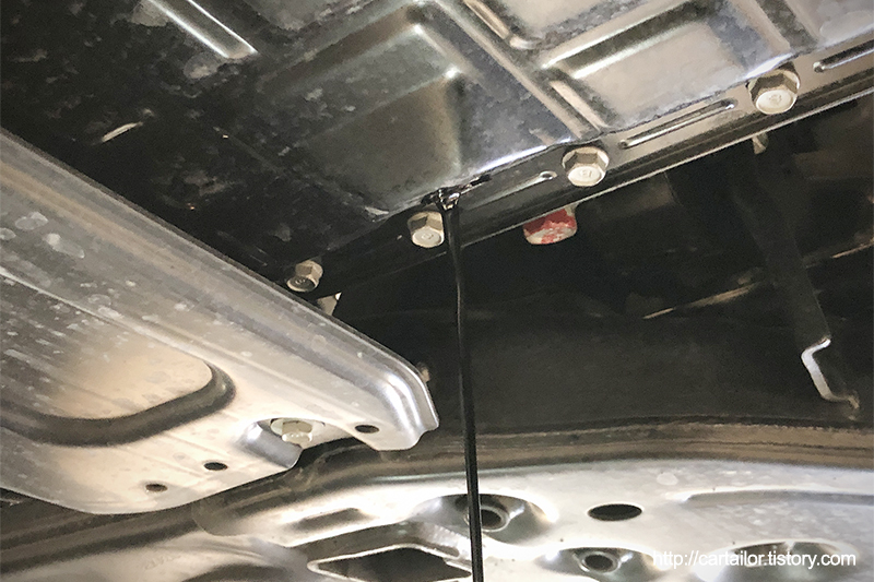 레벨확인 후 다시 시동을 걸고 차를 올려 하부 작업부위를 꼼꼼하게 살펴 봅니다. 작업흔적이나 누유없이 깔끔한 모습인 것을 확인합니다.