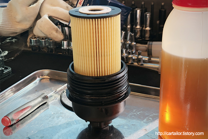 깨끗하게 세척한 오일필터캡에 신품 카트리지와 오링을 장착 후 신유를 잘 발라줍니다.