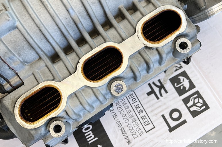 슈처차져를 뒤집에 수냉식 인터쿨러 핀을 살펴 봅니다. 누수의 흔적 등 수리를 요하는 특이사항은 없으나, 오일때로 찌들어 있습니다. 끈적한 오일때는 워할한 공기의 흐름을 방해하고 열교환 효율을 떨어뜨려 달궈진 압축공기의 냉각성능을 저해시킵니다.