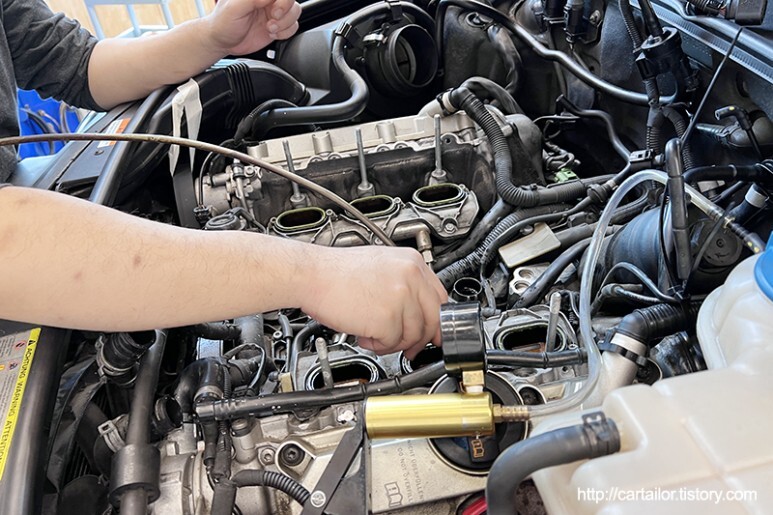각종 호스 및 피팅을 모두 동일하기 때문에 정확하게 마킹하여 재조립 시 혼돈되지 않도록 합니다. 참고로 맨 좌측과 맨 우측의 진공 호스는 각각 뱅크1과 뱅크2의 2차 공기 시스템의 컴비네이션 밸브를 여닫는 역할을 하며, 중간 호스는 가변흡기 플랩을 여닫는 역할을 하기 때문에 뒤 바뀌게 되면 얼마가지 않아 경고등을 만나게 됩니다.