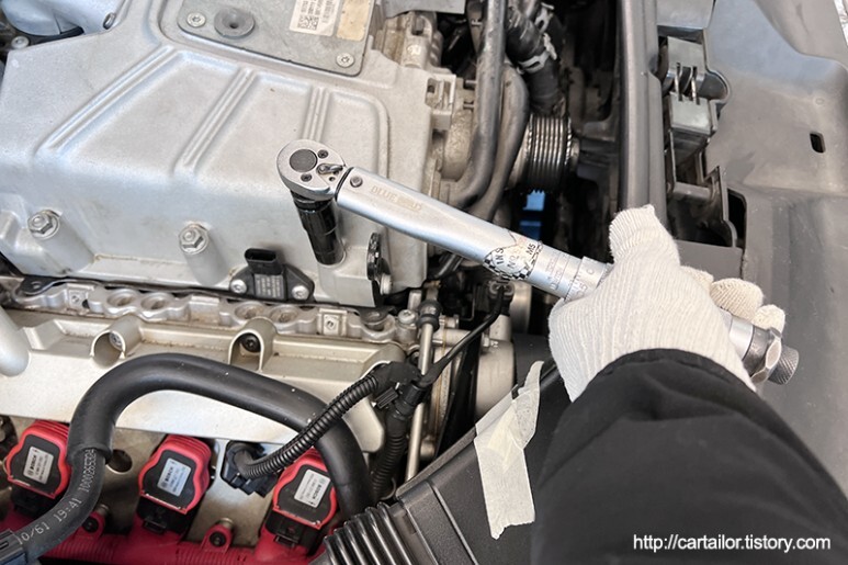 차량이 입고되면 잠시 식혀준 후 슈퍼차져 구동벨트를 분리합니다.