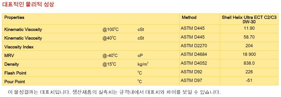 섭시 15도의 밀도는 838Kg/m3 로 왠만한 0W20 가솔린 전용 합성유 보다 묽습니다. 그리고 냉간 유동성을 보여주는 지표 중 하나인, 섭씨 40도씨 동점도 역시 58.70mm2/s 으로 보통의 5W30 합성유들 보다 묽은편입니다. 즉 높은 냉간유동성 및 시동성을 보장받을 수 있으며, 첫 시동 이 후 오일이 순환되는 속도가 빨라 엔진보호에 유리하며 유온상승도 빠를 것입니다. 하지만 열간 동점도는 섭씨 100도씨에서 11.9mm2/S로 일반적인 5W30 엔진오일들과 비슷한 수준이 됩니다. 즉, 열간동점도를 희생하지 않으면서 초기 시동과 냉간운전에 유리한 냉간 동점도를 획기적으로 낮춰놓았습니다. 즉 냉간때는 가볍게, 열간 시 보호가 필요할 때는 충분한 점도 유지력을 보여 주는 훌륭한 오일입니다. 점도지수도 무려 204가 나오며 열간안전성의 평가지표 중 하나가 되는 인화점도 226도로 어마무시 하며, -51도의 유동점 또한 이 엔진오일이 범상치 않음을 잘 보여 줍니다.