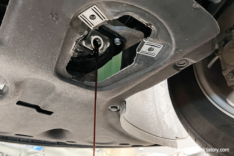 플러그를 개방해 엔진오일을 시원하게 배출해주고요.