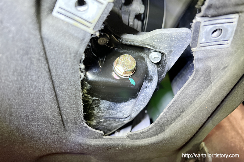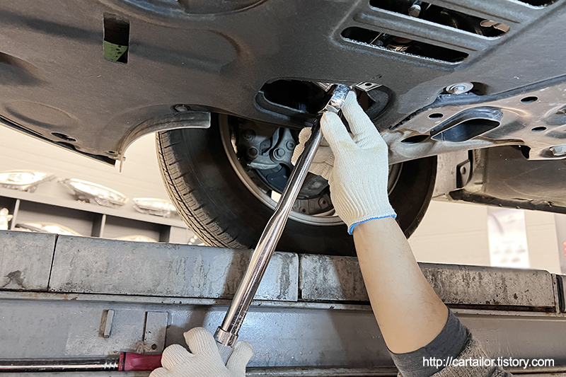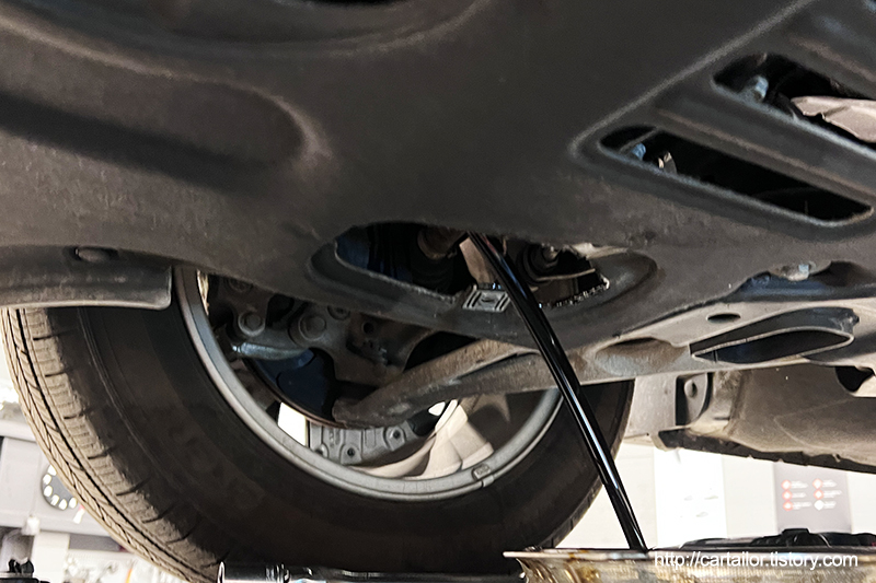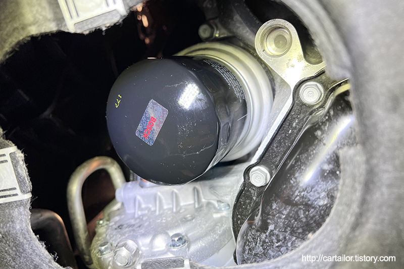 차량 하부에서 기존 오일필터 먼저 제거합니다.