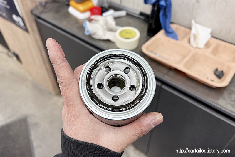 신품 필터 씰링에 신유를 바른 후, 손으로 돌려줍니다. 토크렌치를 이용해 규정토크로 정확하게 마무리하고요.