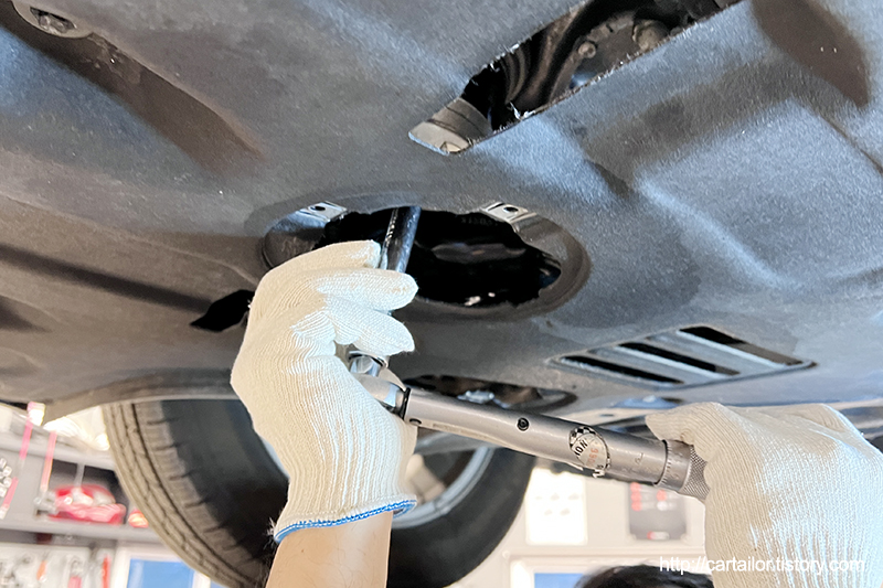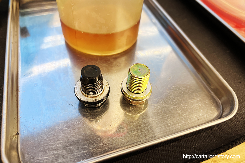 단 한 번도 교체하지 않은 공장출하품 그대로의 와셔가 빠지지 않아 플러그와 와셔 모두 신품으로 교체합니다, 와셔 재사용은 금지입니다. 마찬가지로 토크체결합니다.