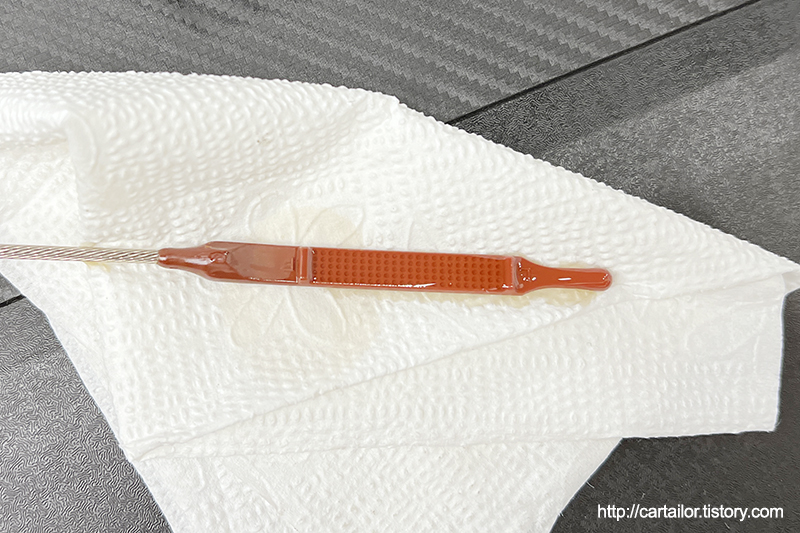시동을 끄고 수분 후 엔진오일 상태를 확인합니다. 상태나 레벨 모두 양호한 편입니다.
