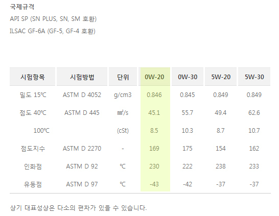 어쨌던, 해당 제품은 GF-6A 규격이기 때문에, 기존 SM, SN 등 구형 규격을 권장한 차량에 문제없이 사용이 가능한 업그레이드 규격입니다. 특히 해당 합성유의 경우 저마찰 특성으로 인해 엔진 부하가 감소하고 가속이 한결 가벼워 집니다. 이로인해 부밍음과 소음이 감소합니다. 연비상승도 기대할 수 있고요. 그리고 높은 점도"지수"(높을수록 오일이 무거운게 아니라 온도에 따른 변화가 낮음)로 인해 더운 여름이던 고속주행을 하던 점도의 변화가 크지 않고 한결같은 필링을 유지할 수 있습니다.