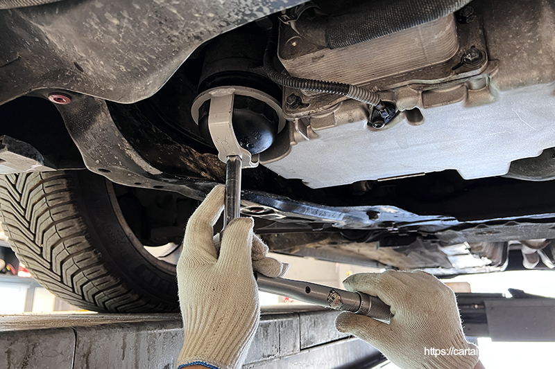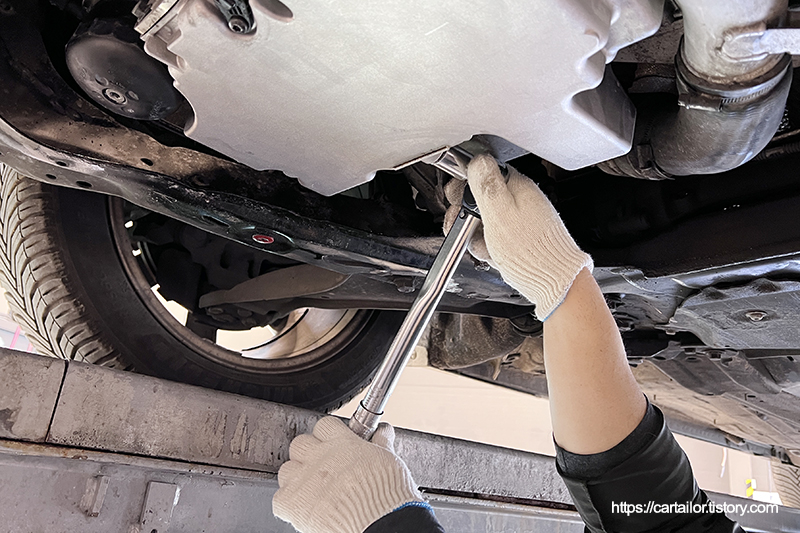 잭포인트에 고무를 댄 후, 차량을 살짝 들어올려 오일팬에 남아있는 잔유를 배출해줍니다.