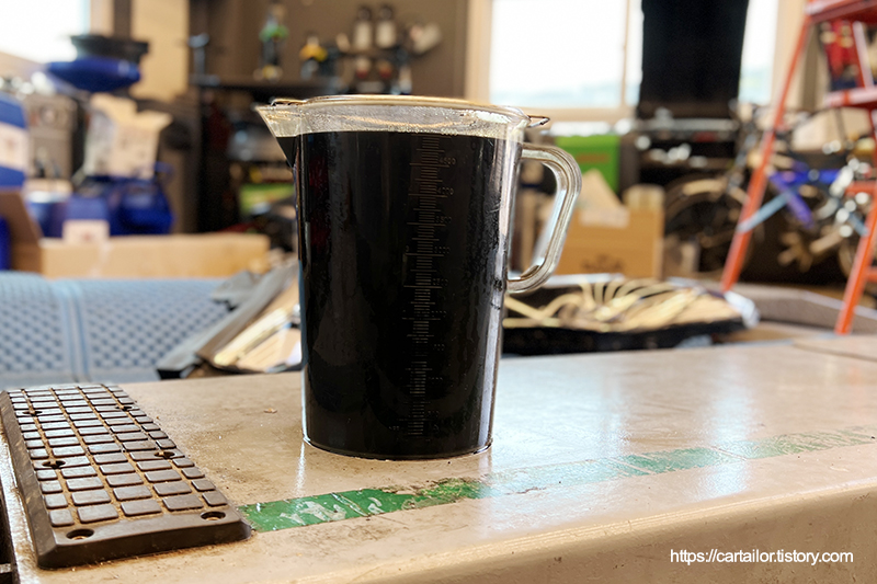 배출이 완료된 사용유 입니다. 육안상 보인는 상태는 보통으로 보이며, 양은 좋습니다.