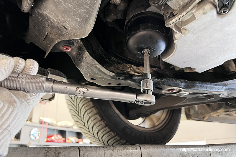 손으로 꽉 잠갔던 드레인볼트는 토크렌치를 사용하여 규정된 잠금값으로 정확하게 체결합니다.