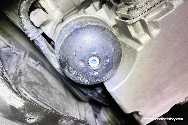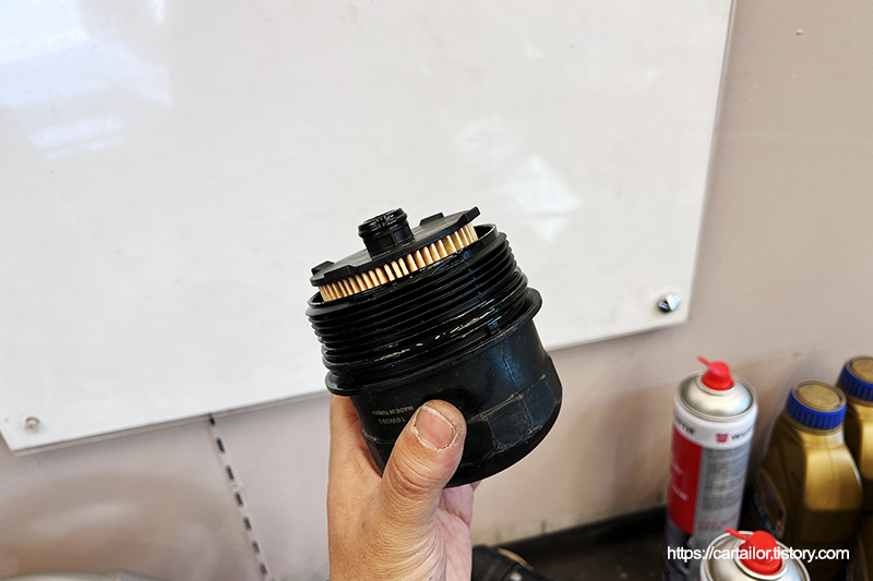 오일필터 하우징을 깨끗하게 세척 후 신품 오링과 필터 그리고 하단에 작은 드레인볼트의 오링을 신품으로 교체한 뒤 신유로 잘 윤활하여 규정토크로 정확하게 조립합니다.