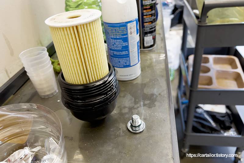 오일필터 및 신품으로 교체한 필터 하단의 작은 드레인볼트는 손으로만 1차 체결 후 토크렌치를 사용하여 각각 정해진 토크로 마무리 체결합니다.