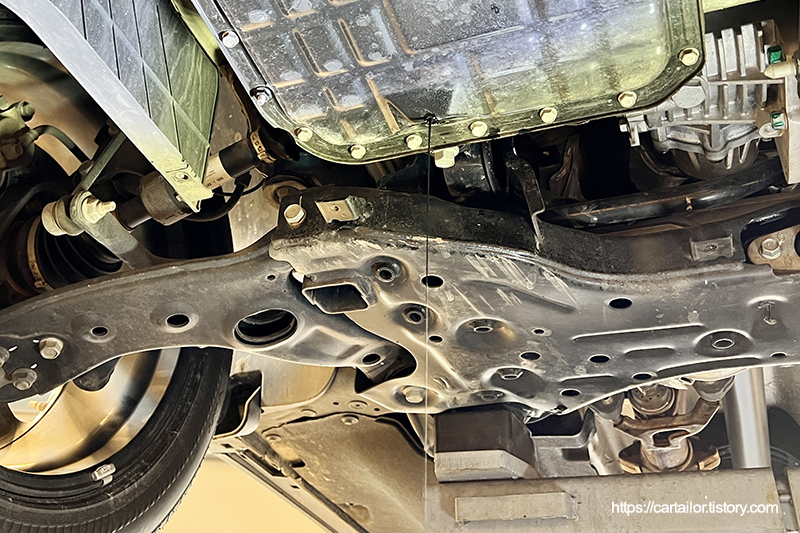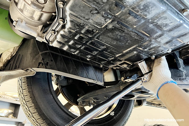 레벨확인 후 차량을 올려 하부 작업부위를 꼼꼼하게 살펴 봅니다. 누유나 특이사항 없이 작업이 잘 완료되었음을 확인한 뒤 언더커버를 조립합니다.