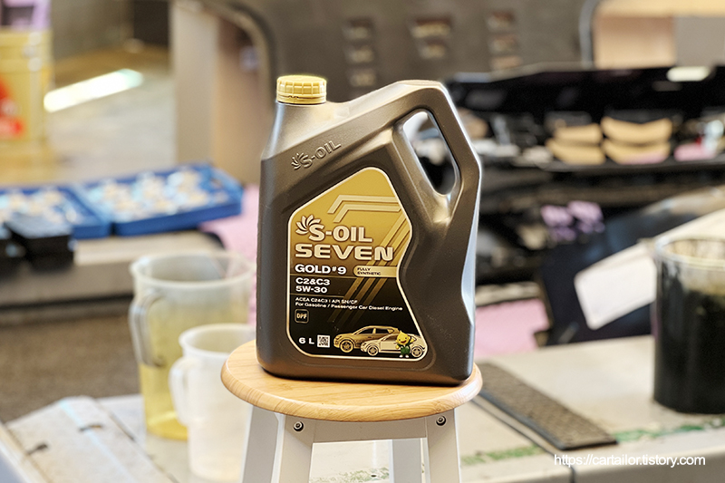 준비한 엔진오일은 에쓰오일 세븐골드 제품입니다. 저희 샵에서 엔트리 라인으로 보유 중인 제품으로, 막상 저렴한 가격에 반신반의 하시는 분들도 많을정도로 S-OIL 7 GOLD는 일명 가성비 오일로 널리 알려져 있는데요. 사실은 가격과 무관하게 그냥 성능이 높은 고품질 오일입니다.