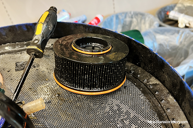 그동안 필터를 준비합니다. 신품 카트리지와 오링에는 신유를 듬뿍 도포하여 조립 중 이탈이나 손상을 방지합니다.