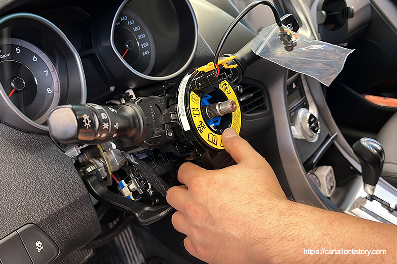 에어백 모듈을 탈거합니다. 그 다음, 핸들을 탈거하기 전 마킹을 해 조향각 위치를 기억해준 후 탈거하고요. 그 외, 교체 및 작업에 필요한 부품들을 모두 탈거합니다.