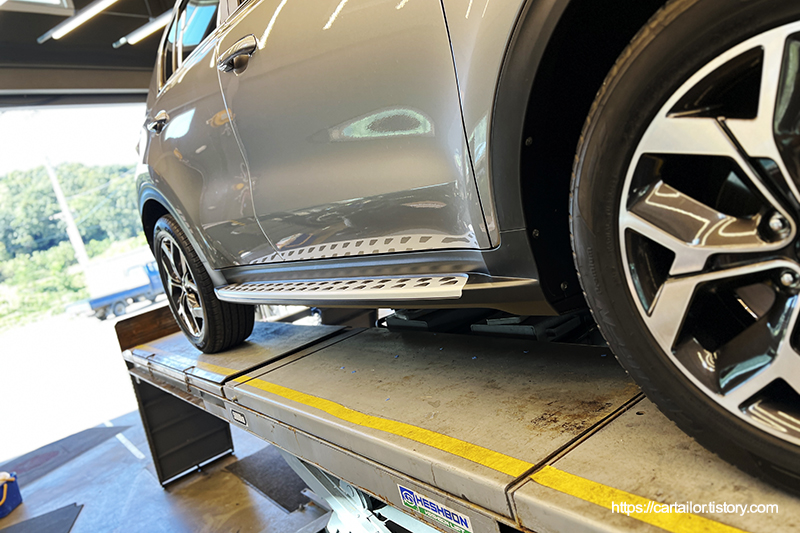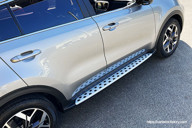 완성되었습니다, 사이드스텝이 장착되어 승하차 시 불편함에 대한 고민을 해소할 수 있습니다. 루프 세차 시 스텝의 도움을 받을 수도 있죠.