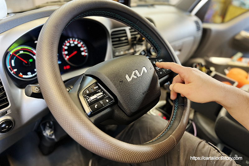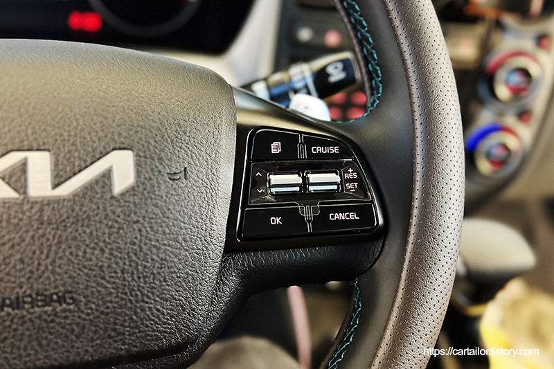 새롭게 바뀐 기아 로고의 에어백이 눈길을 끄네요, 입고된 차량은 열선핸들을 지원하는 사양입니다. 편의사양도 추가된 만큼 크루즈컨트롤도 함께 포함했으며 어땠을까하는 기아에 대한 아쉬움이 있네요.