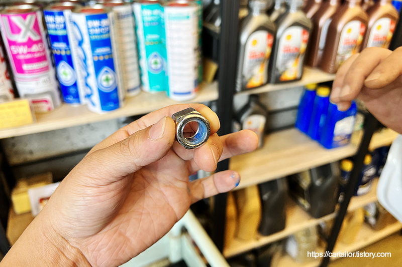 크루즈컨트롤 스위치로 교체가 끝났으면 핸들을 장착합니다. 그 다음, 허브 너트에 나사풀림방지제를 도포해 손으로 돌려주고요. 토크렌치를 이용해 규정토크로 최종 체결합니다.