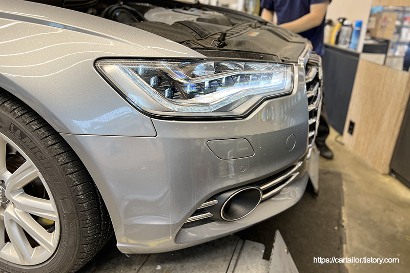 직전 엔진오일교환 이후, 교체시기가 경과되어 입고된 아우디 A6 3.0 TFSI C7차량입니다. 정숙한 V6 엔진에 기계식 과급기가 더해져 시종일관 두툼한 토크와 부드러운 주행질감을 자랑하며 동시에 파워풀한 성능까지 느낄 수 있는 모델입니다.