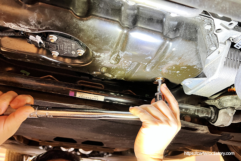 드레인코크를 개방해 기존 사용유를 배출합니다. 용량이 많은 만큼 시원하게 오래 배출됩니다.