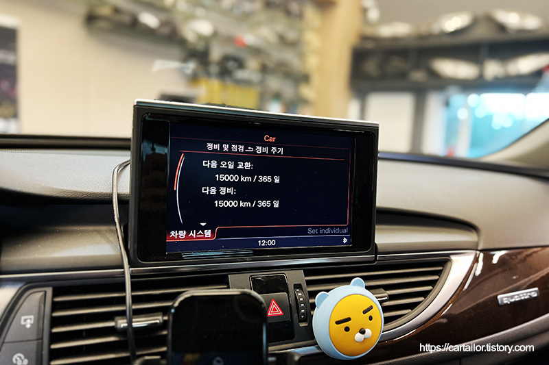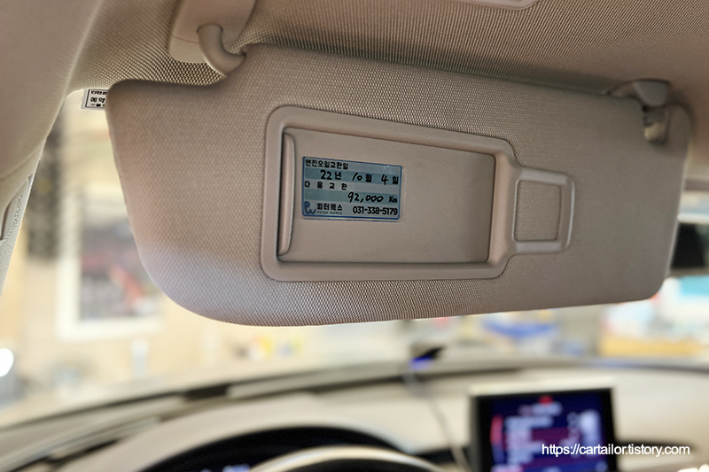 MMI 오일 시기 리셋 및 다음 교체주기가 적힌 스티커를 선바이저에 부착 후 출고합니다.
