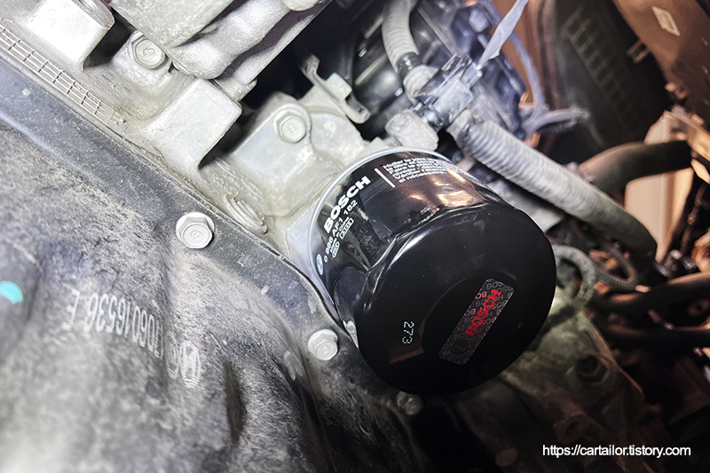 차량 하부에서 캔타입의 오일필터를 제거합니다.