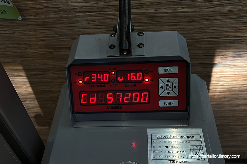 작업 전 광도를 측정해 봅니다. 신차인 만큼 광도는 최상급입니다. 그런데 조사각이 양쪽 모두 상당히 상향이네요.