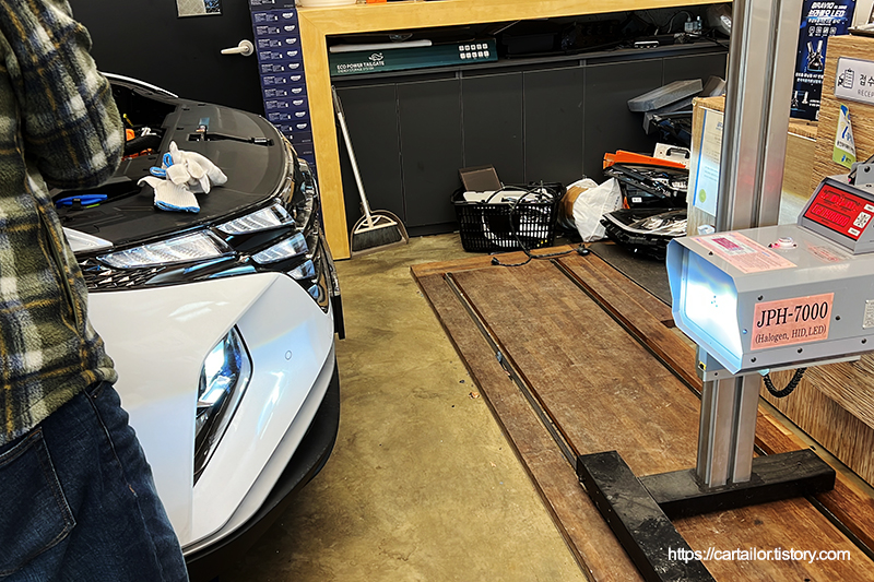브라비오 LED제품을 장착 후 조사각 조정에 들어갑니다. 작업 전 할로겐 상태에서 측정한 수치만 봐도 알 수 있듯 신차라도 이렇게 조사각이 정확하지 않은 경우가 있습니다. 아마 저렇게 심한 상향인 상태에서 LED제품만 교체하고 조사각 조정을 실행하지 않았다면 운전자는 우측 허공을 향해 조사하는 불빛 때문에 LED광원의 야간시야를 온전히 누리지 못해 어두운 느낌만 들었을 것이고 상대방이나 선행 차량들은 심한 눈부심에 시달렸을 겁니다. 제 아무리 밝고 영롱한 광원이라도 내가 필요한 곳에 조사되지 않으면 밝고 시원한 전방시야를 확보할 수 없습니다.