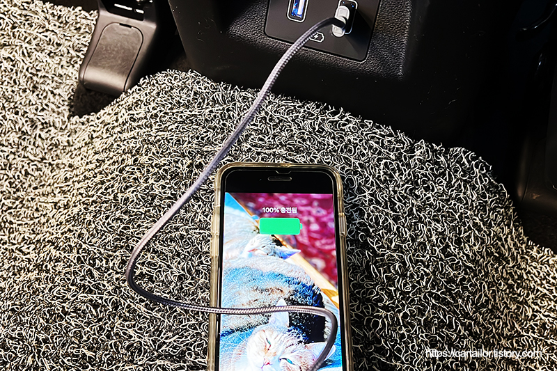 순정 출고 사양과 동일하게 좌, 우측 모든 USB-A 포트를 이용해 충전할 수 있으며, 시동이 꺼지면 전원은 차단됩니다.