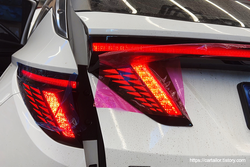 좌측은 작업 전 할로겐 사양, 우측은 작업 후 교체된 LED 사양 콤비네이션 램프의 모습입니다. 이제서야 우리가 아는 NX4의 뒤태를 찾은 것 같은데요, 세련된 외관 뿐 아니라 실제 주행 중에도 LED의 높은 시인성과 빠른 반응 속도로 뒷차에게 나의 존재 및 정지/감속 의도를 보다 빠르고 명확하게 전달할 수 있기 때문에 안전에도 도움이 됩니다.