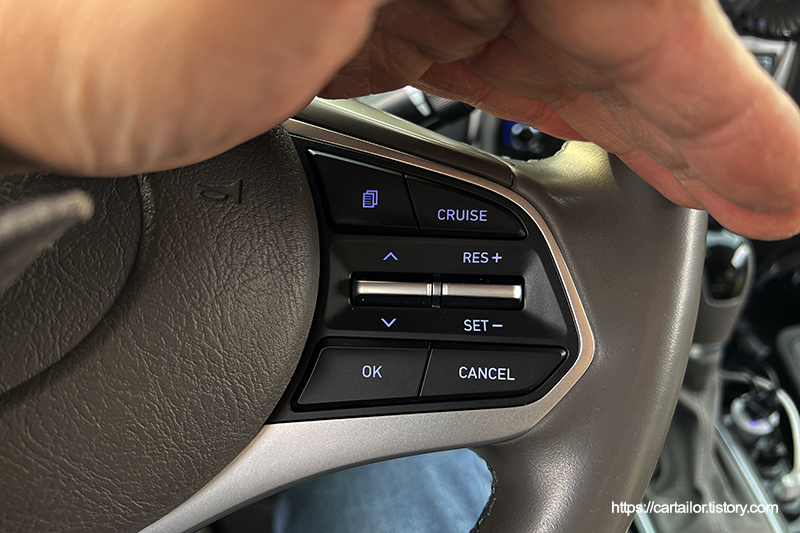 버튼 조명들 모두 잘 들어오며, 크루즈컨트롤 버튼 활성화 시, 계기판에 표시도 잘 들어옵니다.