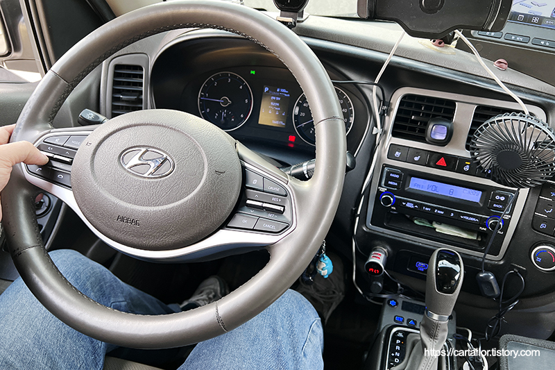 영업용 상용 차량의 대표 명사 중 하나인 현대 포터2 냉동탑차 모델입니다. 스마트 트림으로 출고되어 핸들 리모트 컨트롤러 관련 기능들이 많이 배제되어 있는데요. 여러 기능 중 크루즈컨트롤과 볼륨컨트롤 기능 활성화를 위해 입고되었습니다.