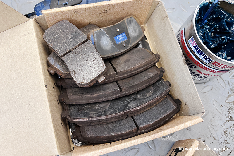 기존 패드를 모두 제거 합니다. 아직 마모량은 여유가 있지만 메탈 재질의 패드의 부식으로 인해 마찰면 표면에 구멍이 보입니다. 크게 문제가 안되는 부분 같지만 패드의 전체 접촉면에서 구멍이 뚫려 있는 면적을 모두 모아서 더해 빼보면 꾀 많은 마찰면적이 손실되게 되는데요, 이는 차량이 제동할 때 부드럽지만 확실하게 서는지 아니면 밀리게 되는지의 차이를 만들게 됩니다.