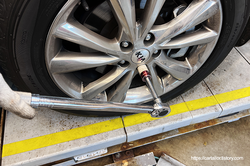 탈거했던 휠은 정확하게 조립 후 모든 볼트는 토크렌치로 잠가 줍니다. 바퀴고정 볼트는 시운전 후 한번 더 확인합니다.