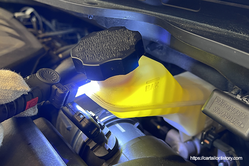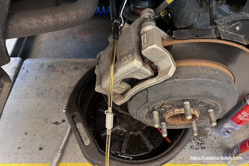 브레이크액을 교환할 차례 입니다. 라베놀의 DOT4 LV 규격으로 총 2리터를 사용하여 밀어내기 방식으로 완벽하게 교환합니다.
