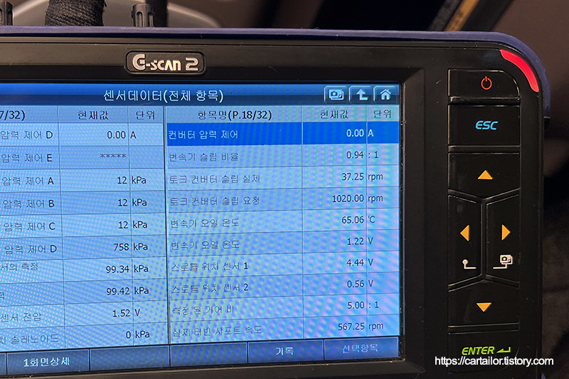 입고 직후 확인한 변속기 오일 온도로, 유온이 높아 팬을 이용해 식힐 동안 다른 작업 먼저 진행합니다.