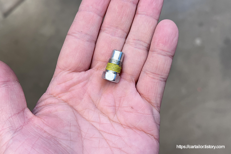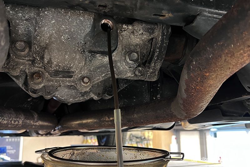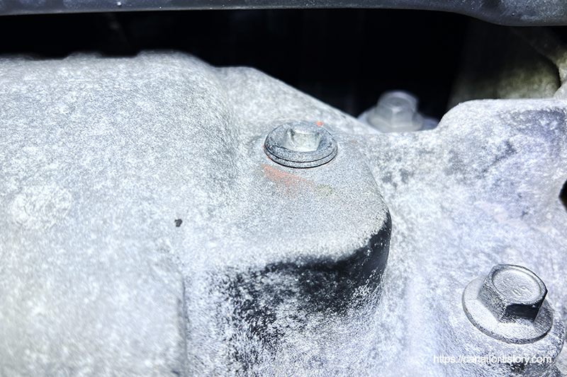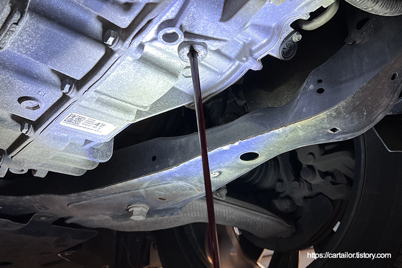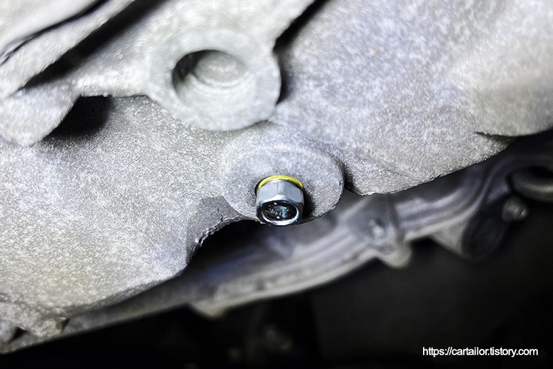 드레인이 완전히 끝났으면 신유 주입을 위해 드레인플러그를 가체결합니다. 해당 차량의 변속기는 2회 주입과 배출을 기본으로 시공하며, 최종 배출이 끝나면 신품 드레인볼트로 체결하게 됩니다.