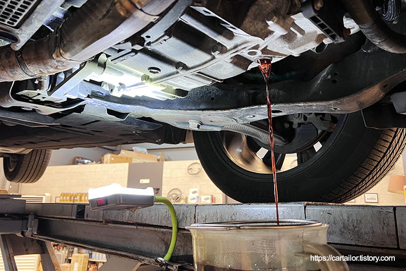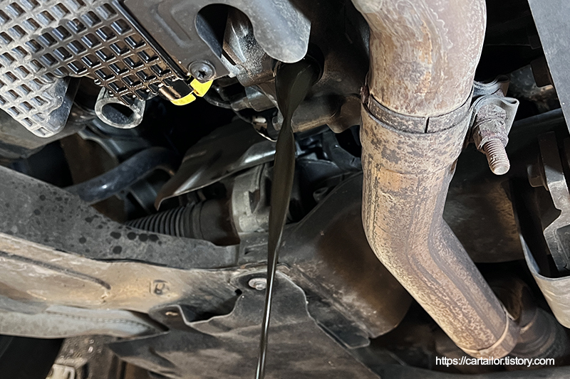기존 사용유를 배출합니다. 교체이력이 없다보니 배출된 오일의 상태가 매우 불량합니다.