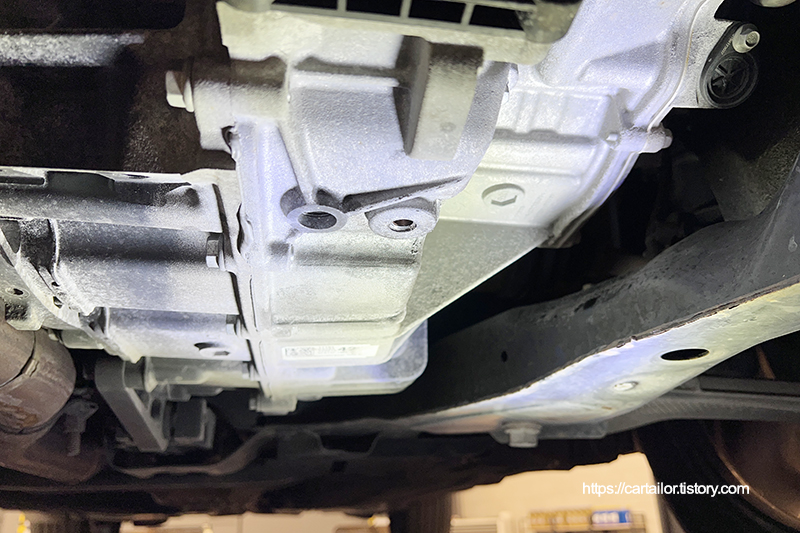 해당 차량은 전륜구동 기반형 4륜 구동차량이기 때문에, 전륜디퍼런셜 메카니즘은 일반적인 전륜구동 차량들 처럼 변속기 내부에 포함되어 미션오일과 공유하기 때문에 미션오일 교환만으로도 함께 교체가 되어 별도의 오일 관리가 필요없습니다. 간혹 전륜구동 기반의 차량이라도 별도의 전륜 디퍼런셜 오일을 사용하는 차량도 있고, 반대로 후륜구동 기반의 차량이 변속기 오일과 전륜 디퍼런셜을 공유하는 경우도 있기 때문에 작업 전 지침서 등을 잘 살펴 보아야합니다.