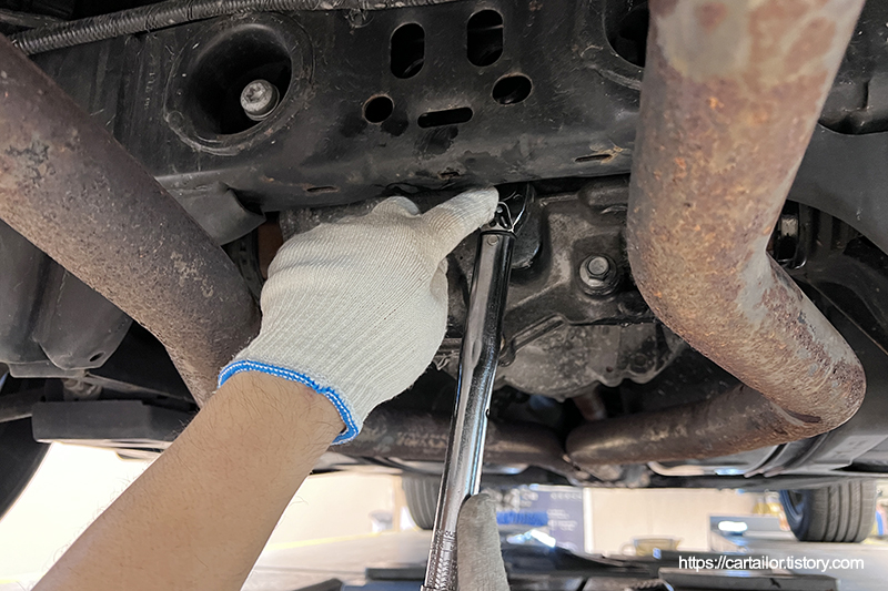 충분한 시간을 들여 드레인이 완전히 끝났으면 깨끗하게 세척한 플러그를 손으로 돌려준 후, 규정 토크로 체결합니다.