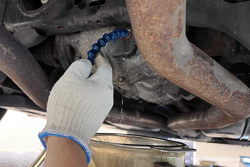 플러그를 개방 후, 오일을 석션합니다. 해당차량의 경우 디퍼런셜은 구조 상, 배출되는 플러그가 없기 때문에 석션 방식으로 기존 오일을 제거해야 합니다.