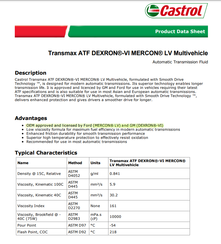 그렇다면 신유는 무엇을 넣어야 할까요? 규격은 쉽고 명확합니다. "MERCON LV ATF"로 GM과 포드의 합작으로 만든 변속기인 만큼 실질적으로 GM의 DEXRON6와 같은 규격이며 두 규격은 늘 함께 따라다닙니다.
